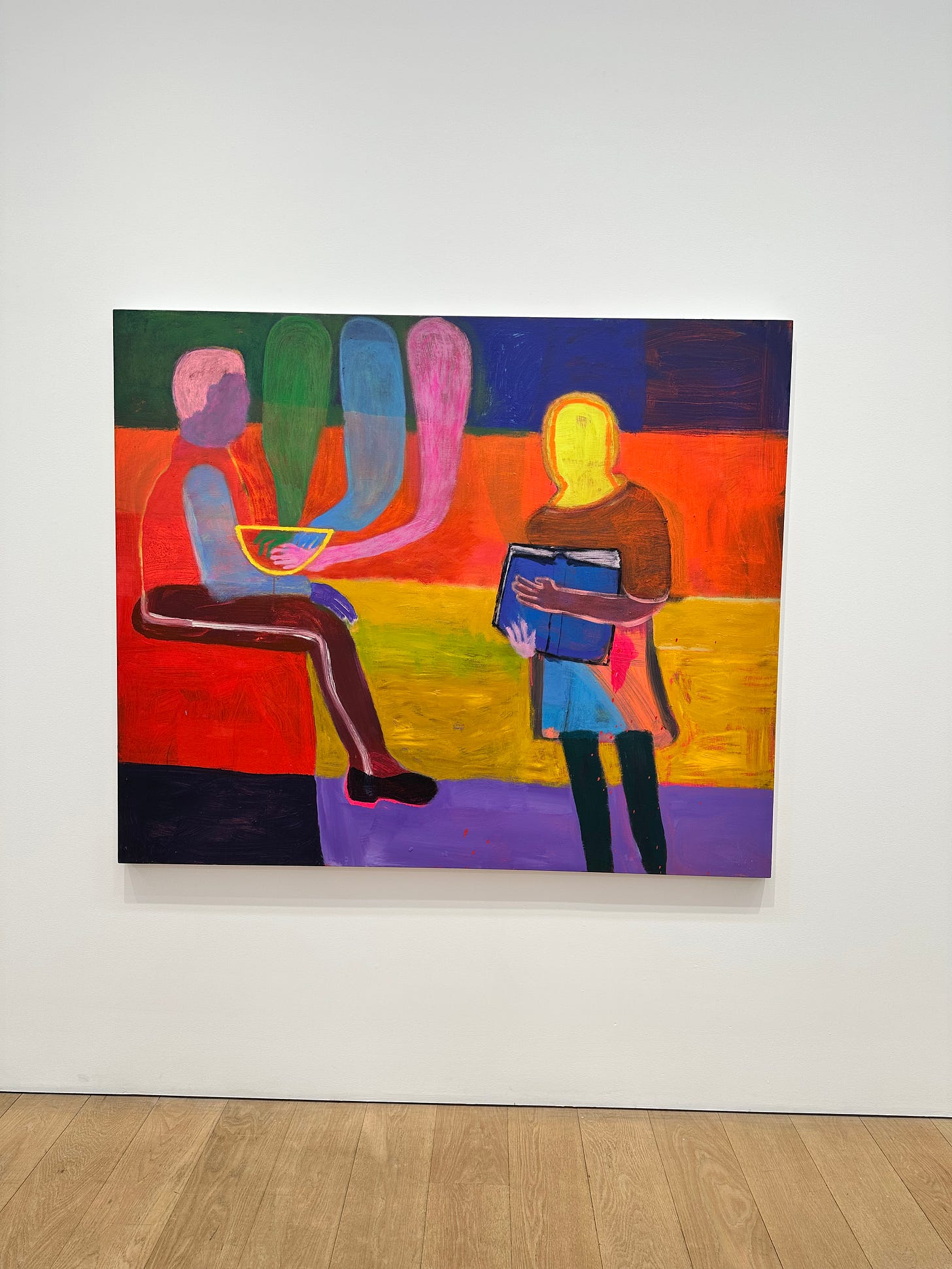 But the painting I cannot get over is by Katherine Bradford, an 83 year old American painter. She’s known for a figurative style of painting where the average person would say I could’ve done that. On the surface, the paintings are striking colours, but every choice is deliberate and symbolic: