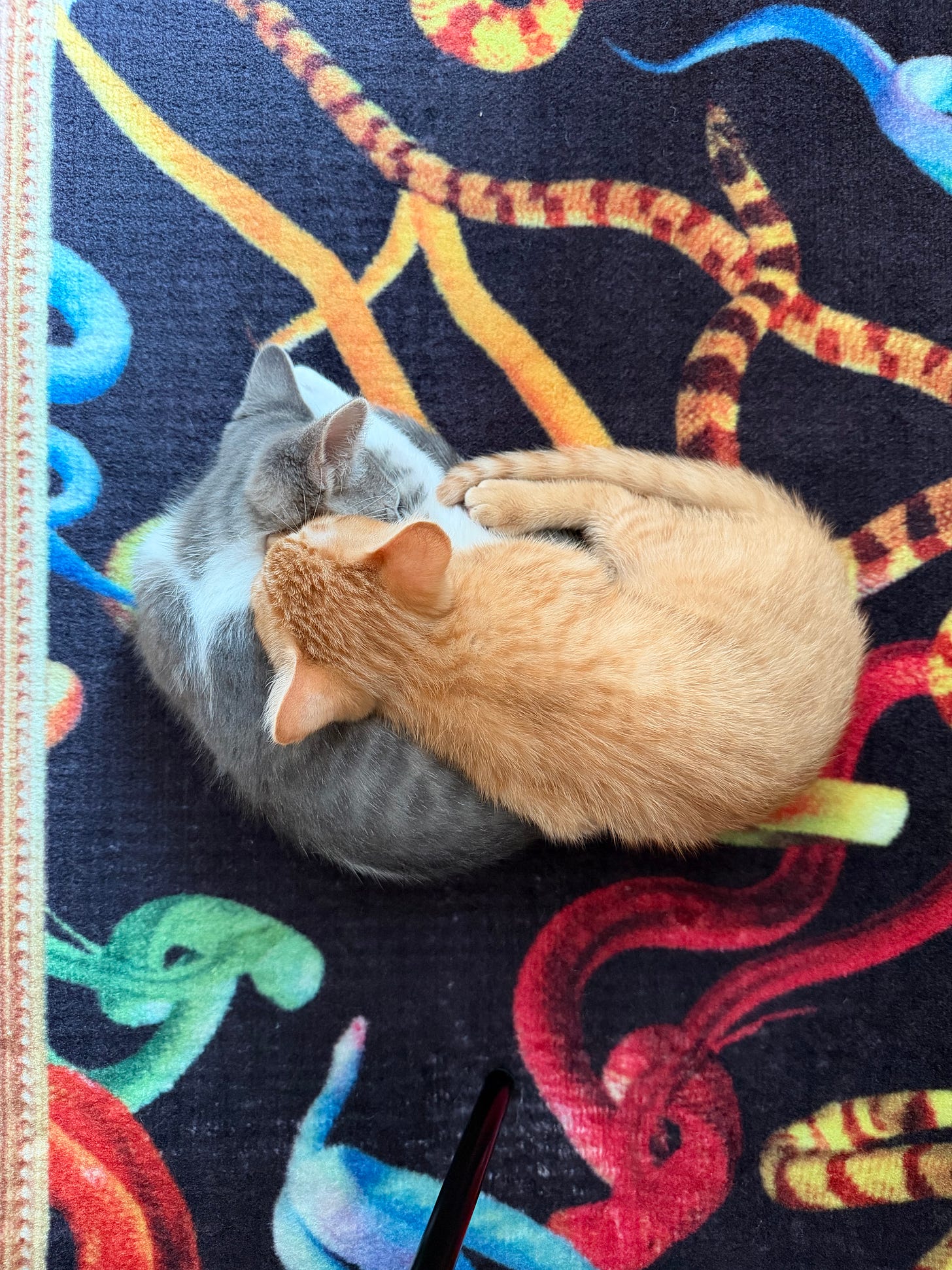 Two bonded brothers. Affectionate. Sweet. Playful. Goddamn non-stop wrestlers. Derek (grey) and Stephen (ginger). Day by day they’re getting more confident and bigger – absorbing our nervous energy as a household of Type-A’s and transforming turbulent energy into a hidden order. A theory famously unpacked in James Gleick’s Chaos: Making a New Science.
